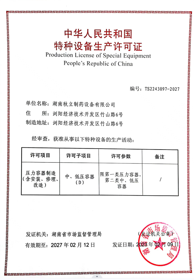 2023年02月09日,湖南秋立製藥設備有限(xiàn)公司(sī)獲得湖南省市場監督管理局(jú)頒發的D類壓力容器製造許可(kě)證與(yǔ)壓力容器設計資格證書。