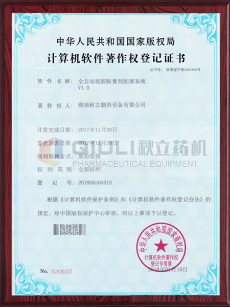 計算機軟(ruǎn)件著作權(quán)證登記證書-凝膠膏(gāo)劑配夜(yè)係統