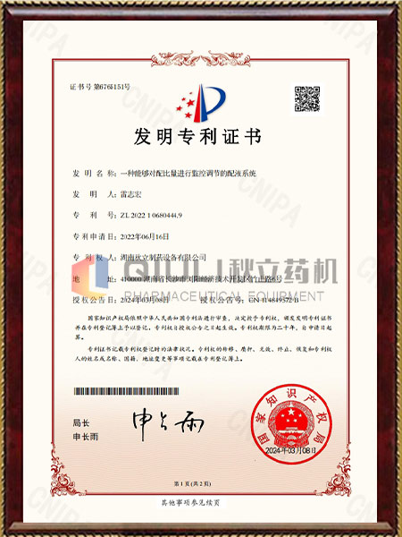 發明專利證書(shū)-一種(zhǒng)能(néng)夠對配比量(liàng)進行監控調節的配液係(xì)統